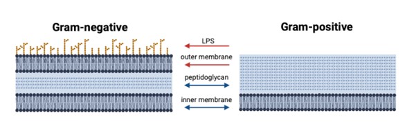Bacteria are divided into two main classes depending on their structure: Gram-positive and Gram-negative (Figure 1). OMVs are classically associated with the Gram-negative bunch. This is because Gram-positive bacteria do not have an outer membrane—their inner membrane is covered with a thick, protein-rich coat called peptidoglycan. Gram-negative bacteria (E. coli is a well-known example) also have a peptidoglycan layer, though theirs is draped with an additional membrane that interfaces with the environment. Long molecules, called lipopolysaccharides (LPS), decorate the outer membrane surface and are one way in which our immune cells interact with bacteria.