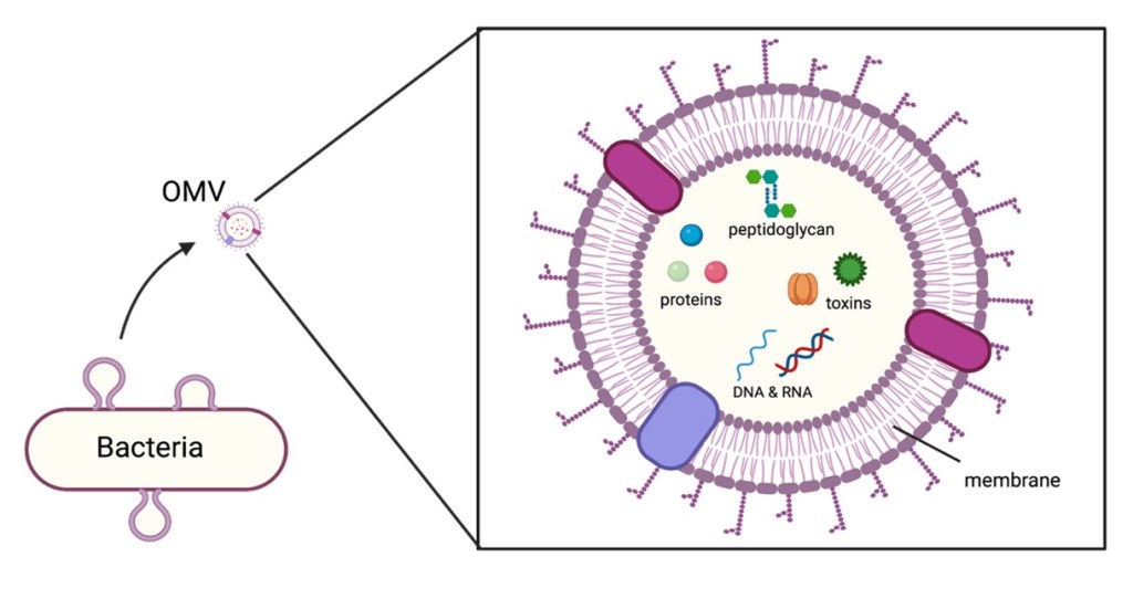 The functions of OMVs are as varied as their composition. For instance, dispose of toxic products accumulating within the bacterial cell, like little cellular garbage trucks. Sometimes instead of acting as waste containers, OMVs help bacteria find food. For example, they can contain proteins that latch onto iron, a critical nutrient for bacterial survival within a host, within the environment so bacteria can easily access it. In addition to assisting their “parent” bacterial cell, OMVs can also disperse within the environment and promote the survival and growth of a broad range of bacteria. Indeed, some bacteria that live in our guts release OMVs harboring enzymes that break down sugars for other intestinal bacteria to feast on. To this end, OMVs are a means by which members of a diverse bacterial community can interact and communicate with one another.