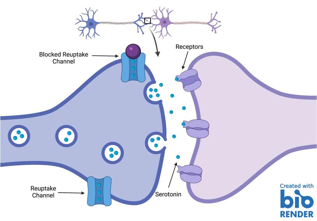 To treat depression, physicians generally prescribe medications called Selective Serotonin Reuptake Inhibitors, commonly known as SSRIs. Typically, after a neurotransmitter has been released and binds to a receptor of another neuron, the neuron that released the neurotransmitter reabsorbs “leftover” neurotransmitters via reuptake channels. SSRIs block these channels, allowing the serotonin to spend more time in the gap between both neurons, and thus, binding to the receptors more often (Fig. 1).