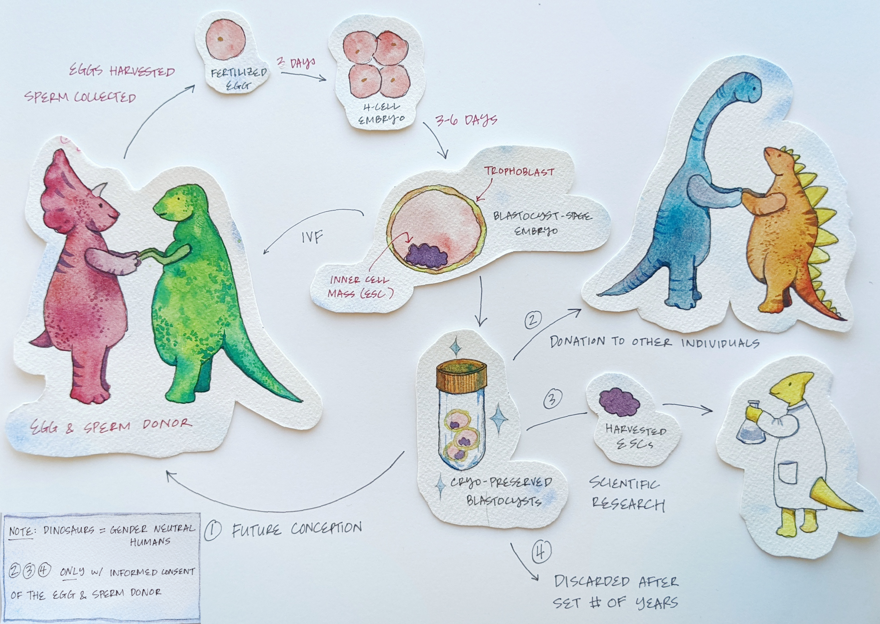 One option is to donate the embryos to other couples who want to conceive. Alternatively, these embryos can be donated to harvest ESCs for research, only if the individuals who sought IVF give informed consent and the embryos are de-identified. If the embryos are not donated for adoption or for ESC harvest for research, they will be discarded.