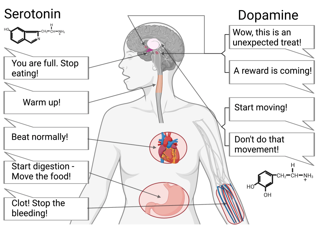 Like dopamine’s role in skeletal muscle movement and Parkinson’s, serotonin also plays important roles in muscle contraction. Serotonin receptors are present in different muscle-containing organs throughout the body, including the gut and the heart. For example, serotonin stored in the cells of the gut wall makes up around 90% of the total amount of serotonin in the human body. When these serotonin stores are released following food consumption, it triggers peristalsis, the muscle contractions that move partially digested materials through the gastrointestinal tract. Interestingly, one type of serotonin receptor involved in gut peristalsis, known as 5-HT4, is also found in ventricles of the heart. High levels of serotonin and their interaction with the 5-HT4 receptor have been linked to irregular heartbeats and heart chamber remodeling. It seems that serotonin plays both a normal role in heart function and repair, and, like many other things, a dysfunctional role if the system becomes imbalanced.