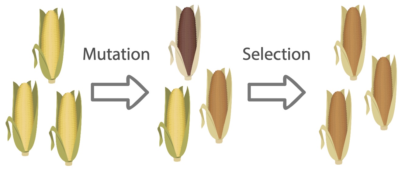 How can we meaningfully distinguish contemporary from historical approaches to agricultural crop development? Agricultural crop development entails finding and propagating plants with desirable qualities, which relies heavily on directing the evolution of these crops, suggesting that meaningful distinctions might be found within the evolutionary process. There are two evolutionary forces that are incredibly important to the agricultural pursuit of better crops: mutation and selection. Mutations occur when the cell makes a mistake copying its DNA, altering the new DNA sequence. If this happens in reproductive cells, the resulting offspring might have new or different traits. Selection is the process by which certain traits dictate which organisms will either have offspring and continue their genetic lineage or die before producing offspring (Figure 1). Historically, humans have utilized the selective force of evolution to produce new crop strains, but with recent advances in genetic engineering, humans are increasingly taking control of the mutation force as well. By exploring the history of these two evolutionary forces in agriculture, the distinction between contemporary and historical agricultural crop development becomes clearer.