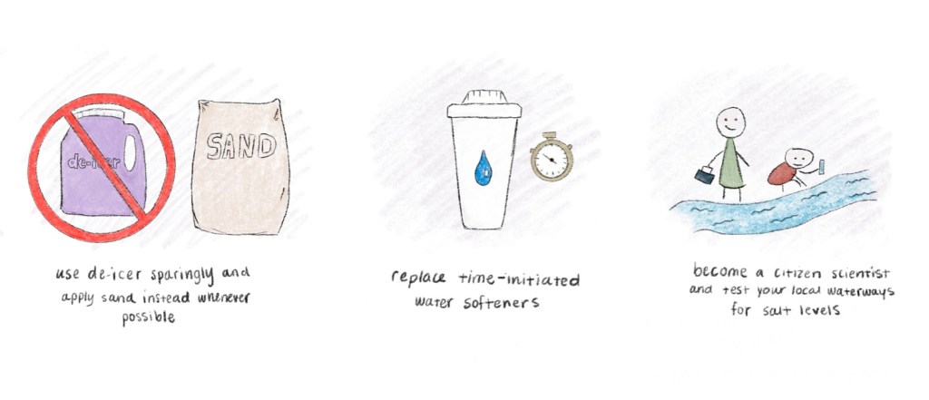 One thing anyone anywhere can do is spread the word (not the salt). I was introduced to this problem last year, as a graduate student! You can inform the newest generation, make it a family activity, or an outdoor activity for your classroom. The Izaak Walton League of America has launched a “Winter Salt Watch” kit to measure salt levels of streams and lakes near you. This is a citizen science approach where your results are uploaded to a shared database.
