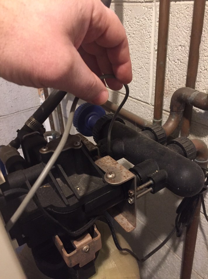 El Centro de Recursos de Agua de la Universidad de Minnesota (WRC, por sus siglas en inglés) ha descubierto que muchos suavizadores de agua viejos son controlados por temporizadores. Esto significa que sin importar cuánta agua haya sido suavizada, el instrumento se regenerará en un tiempo específico. Si su residencia o negocio depende de agua suavizada, verifique que el suavizador no sea uno controlado por un temporizador. Si es posible, reemplácelo con un suavizador más eficiente con regeneración basada en demanda (DIR, por sus siglas en inglés). Los suavizadores DIR usan 26-60% menos sal que los suavizadores con regeneración controlada por un temporizador. Además, estos ayudan a conservar agua y usan 25-40% menos agua que suavizadores con temporizador. Usted puede identificar si su suavizador de agua tiene temporizador si tiene un cable entre la entrada del agua y la salida hacia la plomería de su casa. Este cable está señalado con una flecha naranja en la siguiente foto: