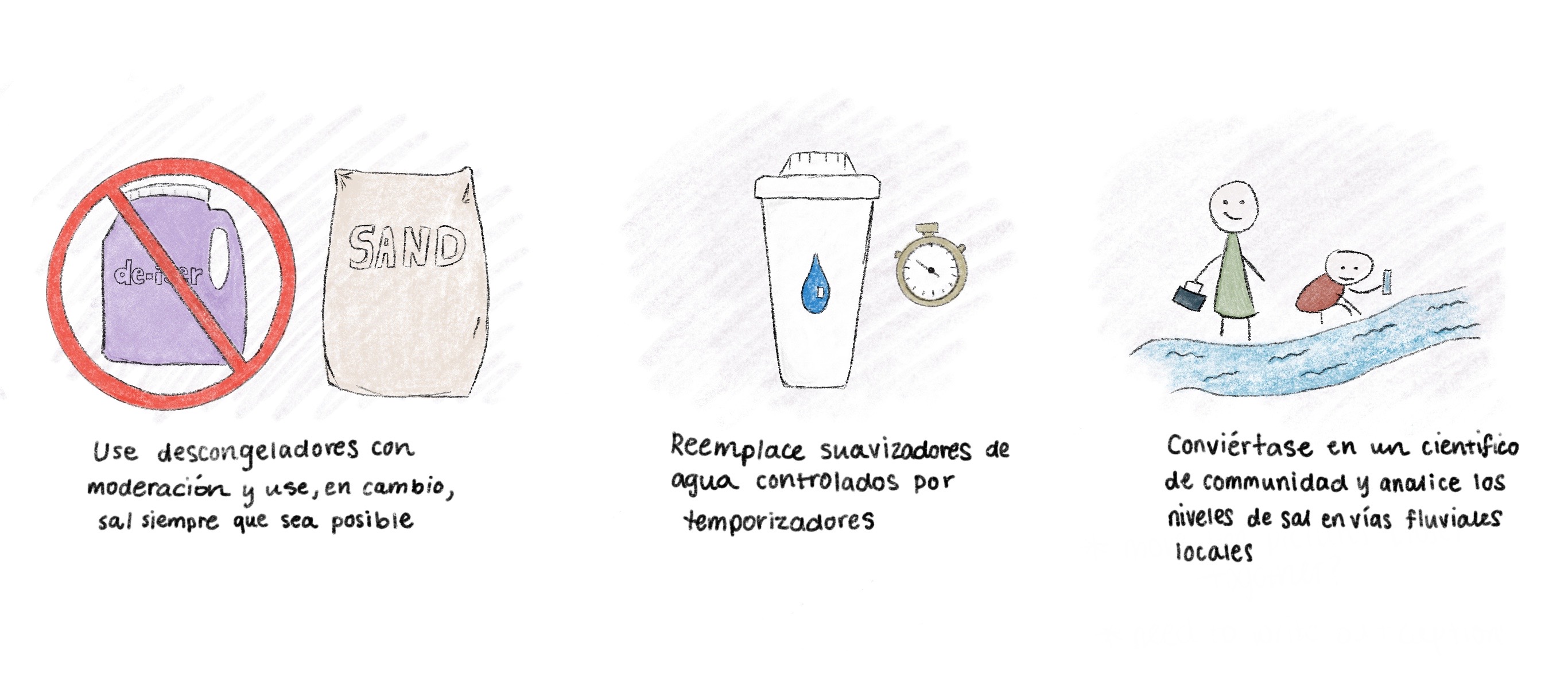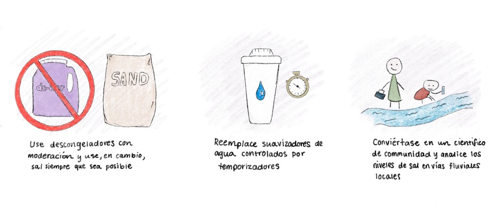 Algo que cualquiera puede hacer es propagar la información (¡no la sal!). ¡Aprendí sobre este tema el año pasado como una estudiante graduada! Puede informar a la nueva generación, hacerlo una actividad familiar, o una actividad en el exterior para su clase. La Liga de América de Izaak Walton ofrece un kit de “Monitoreo de Sal de Invierno” para medir niveles de sal en arroyos y lagos locales. La liga sube estos resultados a una base de datos que comparte información de salinización en todo el país.