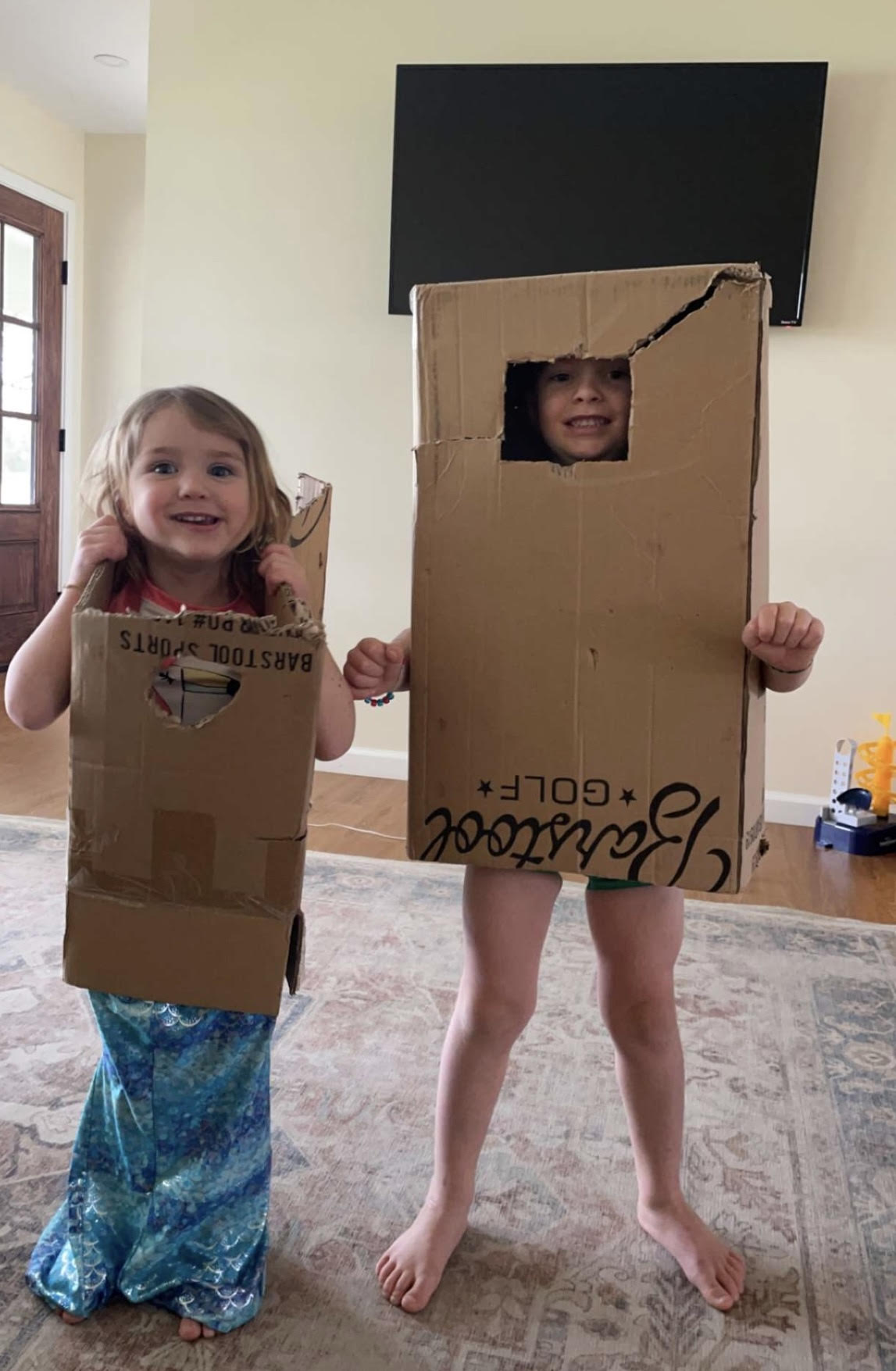 As I write, my three year old niece and five year old nephew are outside madly chasing chickens while wearing cardboard boxes that they have fashioned into robot armor. The vigor and stamina on display–by both the children and the chickens–are impressive and remind me of my childhood escapades. Once, I hosed down my family’s garage with two inches of water to make a more difficult (i.e., dangerous) rollerblade obstacle course for myself and my siblings. Another time, my sister and I duct-taped large exercise balls to our bodies so that we could run into each other repeatedly.
