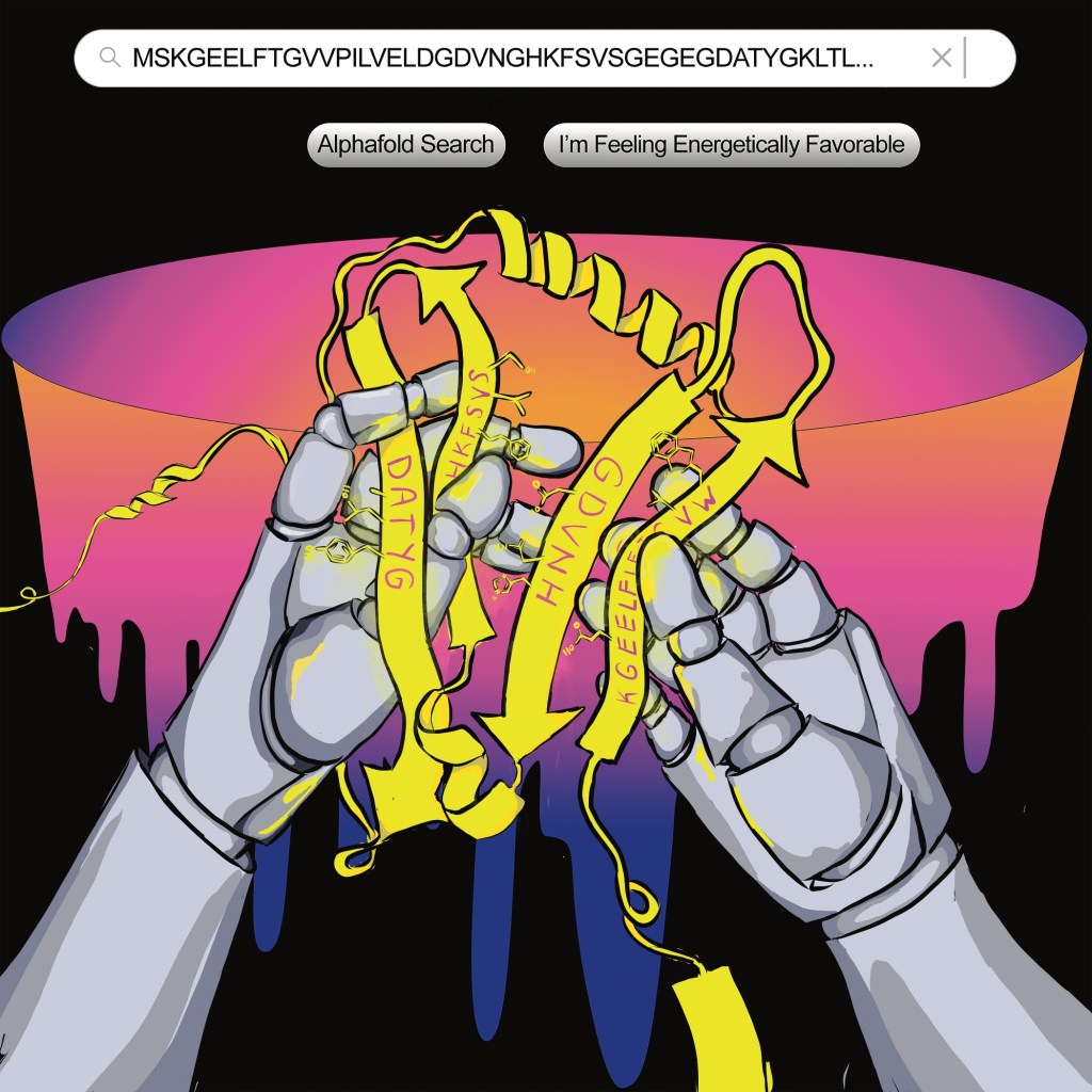 This artwork anthropomorphizes AI, lending human qualities to the incredibly computational task of predicting the shape of a protein. Human-like robot hands are entwined in the beta sheets of yellow fluorescent protein (YFP) as if one could knit with a string of amino acids, connoting both the artistry and analysis involved in determining a protein’s structure de novo. The protein itself, YFP, is derived from bioluminescent jellyfish and is routinely used by scientists to track the movement of other proteins through the cell, attaching YFP to other cellular proteins like travelers attach colored tags to their luggage so it stands out among a sea of black suitcases. This technique is only useful, however, if YFP is attached to the protein at an innocuous site – if the YFP is attached to the protein being tracked at a location that interferes with its function, the experiment is rendered useless, and thus, in another sense, knowing the structure of the protein is essential to knowing its function. In the background is a graphical depiction of the energy landscape of protein folding. In its final form, the protein will be in a deep valley, signifying a stable conformation. Above the scene is a search bar containing the amino acid sequence of YFP, the only information needed for AlphaFold to predict its structure.