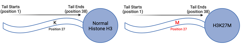 Cancers can be driven by a variety of gene mutations impacting processes such as cell division, DNA repair, and metabolism. The majority of DMGs share a common mutation known as H3K27M, which impacts epigenetics. Epigenetics modify gene expression rather than the DNA code itself, so H3K27M interferes with how and when genes are typically expressed. The H3K27M mutation occurs specifically in a protein called histone H3, which is where it gets the first part of its name from. The K27M part of its name indicates that the mutation changes the twenty-seventh amino acid, or protein building block, from lysine (K) to methionine (M) (Figure 2).