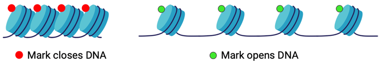 Part of the reason that the H3K27M mutation causes epigenetic changes is because of the role that histones play in how a cell’s DNA can be expressed. Histones are small, round proteins with tails that keep the DNA in every cell wrapped up and organized, making them partially responsible for which genes are expressed. They function in groups of eight, called octamers, to allow the nearly six feet of DNA present in each cell in our bodies to coil up around them. Small chemical tags, or epigenetic markers, get added to histones at specific locations on their tails and can directly impact how tightly the DNA can wrap around the histone octamers (Figure 3).