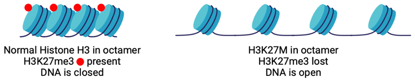 PRC2, whose main role is to place the H3K27me3 closing mark, is most commonly associated with regulating the timing of gene expression during the development of organs, including the brain. Genes that are controlled by PRC2 are essential for ensuring the brain is growing and developing appropriately before a child is born. It is equally as important that these neurodevelopmental genes get turned off once they are no longer needed. In a cell with an H3K27M mutation, where normal PRC2 function cannot happen, these developmental genes are expressed in an already developed brain. While this will not directly cause cancer to start growing, it does “turn back the clock” in cells with the mutation.