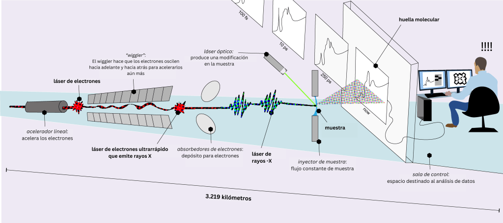 Esta ‘maratón’ es imprescindible, ya que estamos utilizando el láser de electrones libres de rayos X (XFEL por sus siglas en inglés, que significa “X-ray free electron laser”). Un XFEL es un equipo de varios kilómetros de longitud capaz de realizar experimentos que van desde descubrir la estructura de proteínas del cuerpo humano hasta simular las presiones y temperaturas extremas en el centro de la Tierra. ¡Más allá de su potencia y versatilidad, el XFEL adquiere aún mayor relevancia dado que solo existen cinco XFELs operativos a nivel mundial! Para llevar a cabo investigaciones con estos equipos, es indispensable desplazarse por todo el mundo. Este privilegio es excepcional. Dado que el tiempo de experimentación en un XFEL es un recurso altamente preciado, nos esforzamos considerablemente para evitar cualquier pérdida de segundos en la utilización de los rayos X. Es así como surge la necesidad de la maratónica jornada de 60 horas.