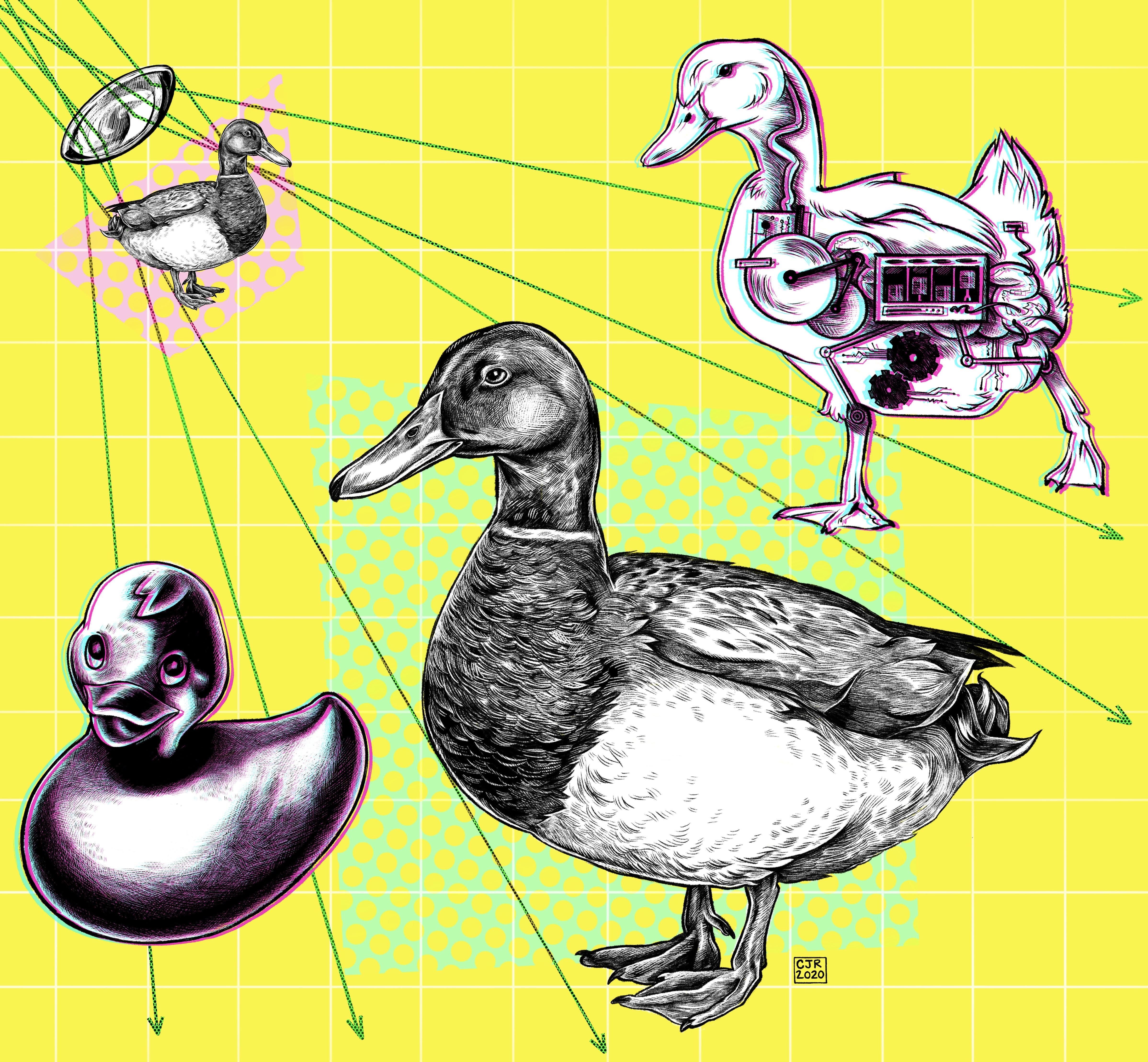 All the light we see first travels through a lens. The lenses in our eyes refract the light from our world, distorting it for our brains to reconstruct. Our visual reality is virtual, containing a degree of separation between reality’s undistorted, true form, and ultimately our perception. The true nature of reality has been the discussion of philosophers for generations, from Plato’s allegory of the cave to René Descartes’ reductionist theory of life. Descartes argued that a sufficiently complex machine, or automata, would be indistinguishable from a living animal. That is, Descartes perceived life to be a collection of parts that could be disassembled and reassembled. A century after Descartes published his theories on natural reductionism, his ideas on the mechanical reality of life were practically tested. In 1739, the French inventor Jacques de Vaucanson unveiled his Digesting Duck — a duck-shaped machine that appeared to be able to eat and defecate. The Digesting Duck in actuality was incapable of digestion but could be perceived to be without disassembly to reveal its internal workings. What is the true nature and reality of a duck that we see refracted through a lens? Refracted Ducks playfully presents three virtual images of a refracted duck, with various degrees of separation from its original form, from a reductionist machine to a simple rubber toy.