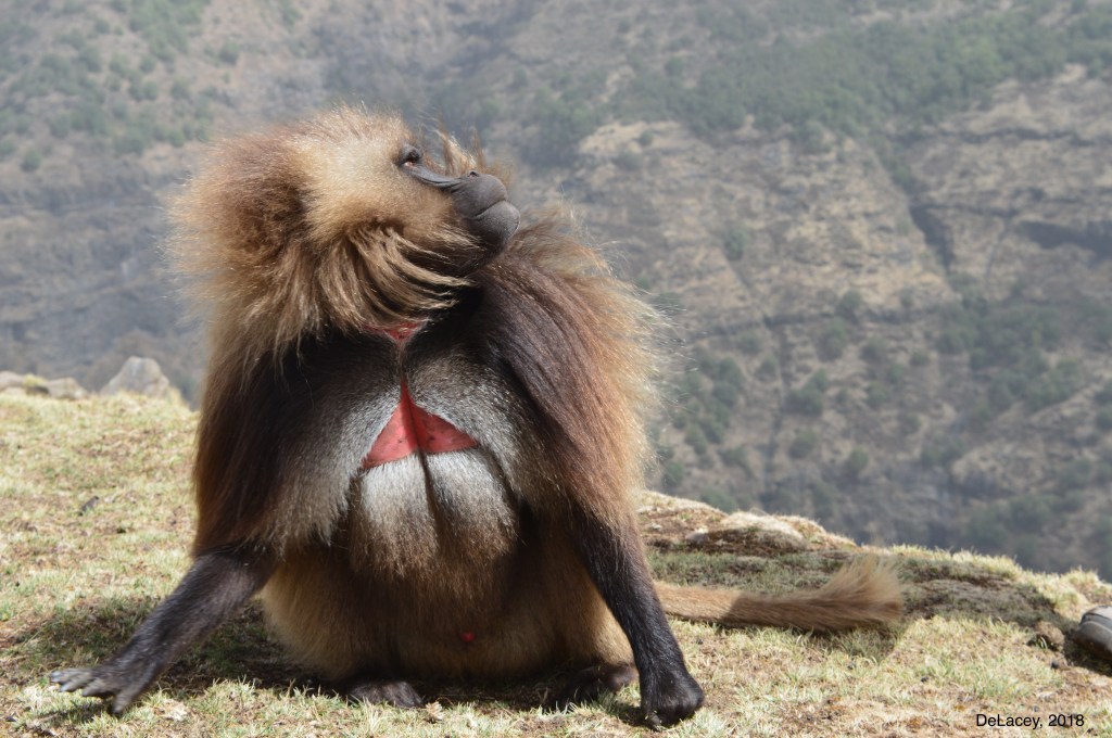 It was a cloudless morning in the Simien Mountains National Park in northern Ethiopia. “There,” said Esheti pointing down the cliff, spotting the geladas1 with an expert eye. Through my binoculars I saw a line of geladas amble up the sheer cliff. Once they reached the grassy plateau, I collected behavioral data. Talisman, the dominant male of a unit, was groomed by the adult female, Coco, while he puffed out his chest. His bright red chest patch and golden-brown mane looked particularly impressive juxtaposed to Tecate, the subordinate adult male in the unit. Tecate’s mane was short, his shoulders sloped inwards, his chest patch noticeably pale pink instead of red. Looking at the surrounding geladas, I noticed the variation in chest patch color across male dominance status.2 What could be the purpose of exposed red skin in a cold, high-altitude environment, and why is there variation in red color? This puzzling unique trait is putatively linked to reproductive success and sexual selection.
