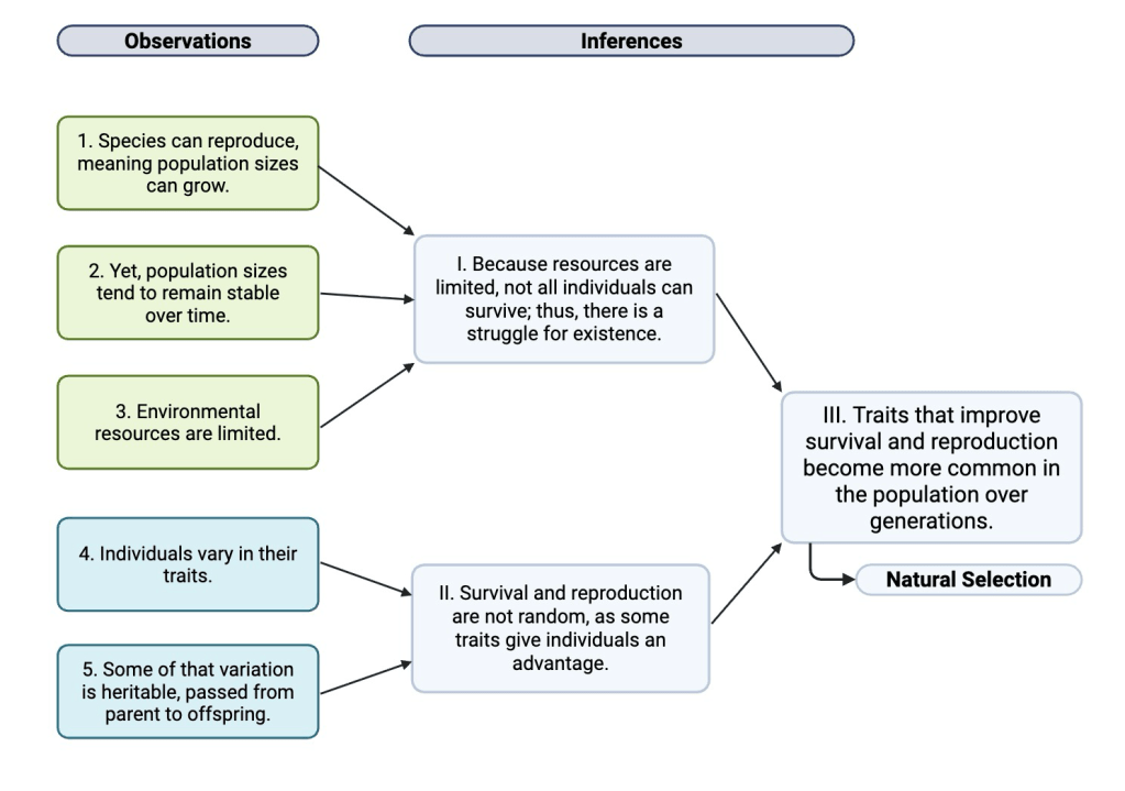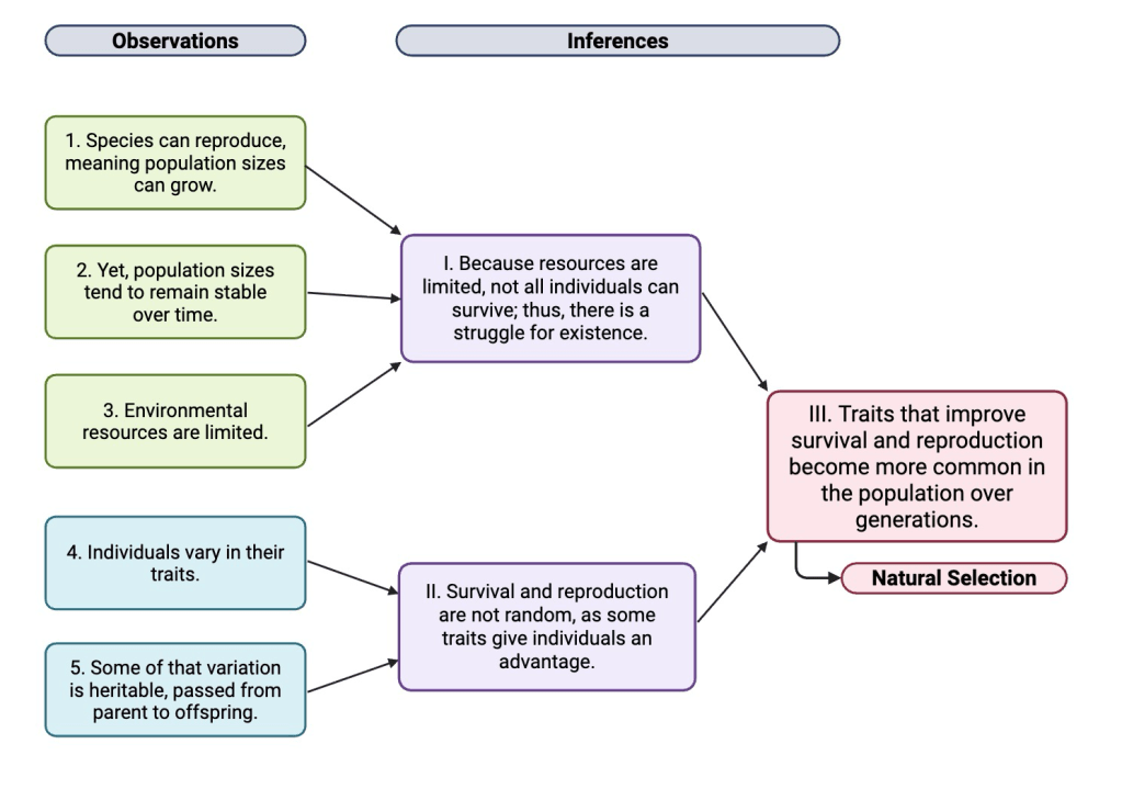 Almost a century later, in the 1940s, the evolutionary biologist Ernst Mayr organized Darwin’s findings into five observations and three inferences, now known as adaptation by natural selection.