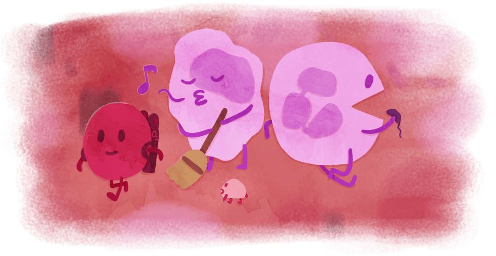 She glanced around for others. White blood cells, including neutrophils and monocytes, bobbed along – big, blobby, and always on patrol. Though few in number, these immune cells came in all shapes and sizes, guarding the body from infection and invaders.7 Neutrophils were hard to miss, rushing toward inflammation and swallowing threats whole, leaving a mess behind like it was no big deal.2 Pippa found them brave and relentless –impressive, if a bit overzealous. She preferred the monocytes – the larger, slower, and smarter of the bunch – who cleaned up after the chaos, helping wounds heal once the battles ended.7