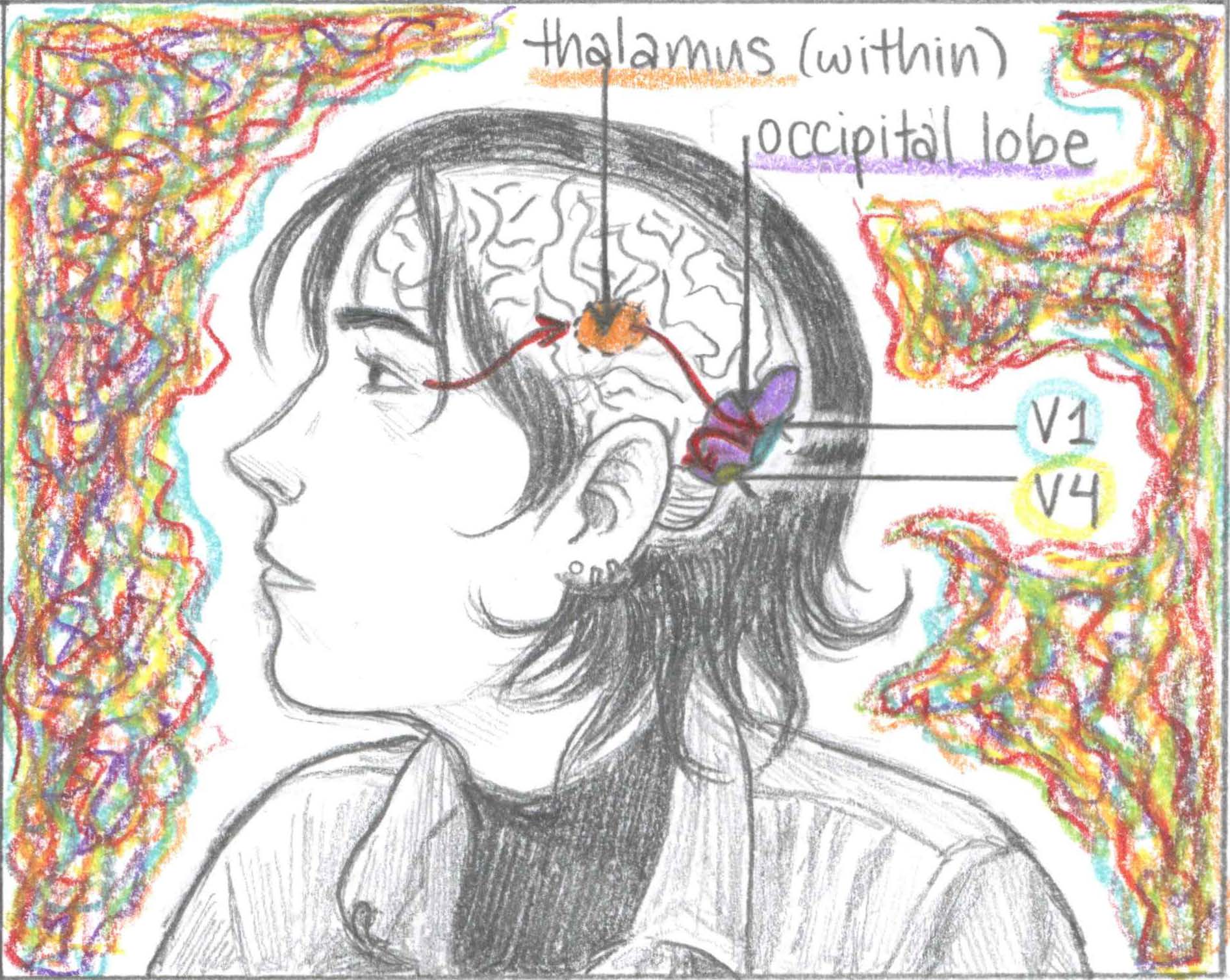 Once these cones detect light of their preferred wavelength, they convert it into electrical signals that travel back along the optic nerve.6 These signals are routed through the thalamus to the primary visual cortex (V1) at the back of your brain,7 before then passing onto regions like the 4th visual area (V4), which play a critical role in shaping our perception of color8 Other brain regions integrate color signals with context, memory, attention, and even emotion, enriching the raw sensory input into the vivid experiences we recognize as a “color”.9–11
