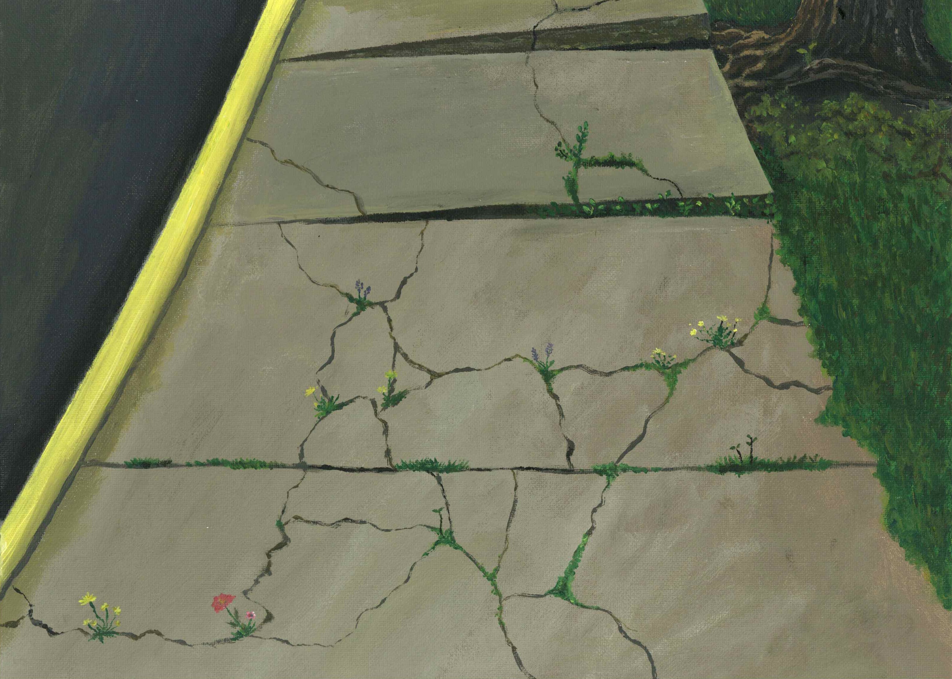 Despite human interference, nature can and will push through. If we slab a concrete path down, over time the strength of surrounding tree roots will overpower the path and break through. Little yellow flowers will find themselves pressing up through the cracks, reaching toward the sun. And while I may trip over those cracks, I’m always in awe of how resilient nature is. I wanted to capture that quiet, persistent power in this piece. In the top right corner, an old-growth tree reclaims its territory, uprooting the sidewalk as it stretches outward. You’ll find the grass and moss inching its way through the cracks in the path. Despite the concrete’s water-leeching properties, you’ll see colorful flowers sprinkled throughout.